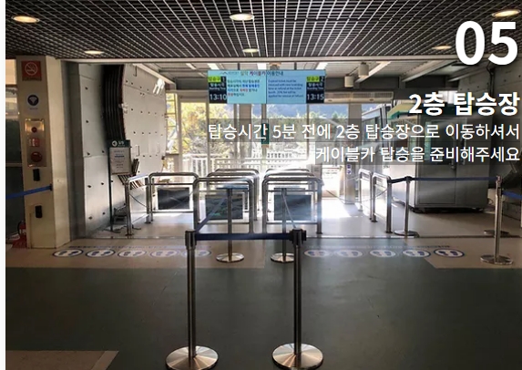 | 소요시간 | 편도 5분 / 왕복 10분 소요 충분히 경치를 보다가 내려가는걸 타셔도 되나, 꼭 마지막 케이블카는 탑승하셔야 합니다. |