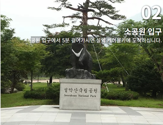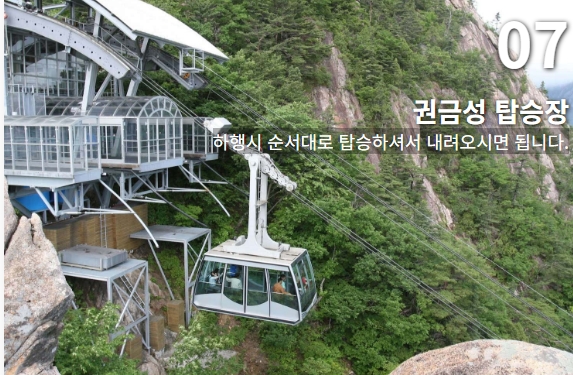 | 케이블카 정보 | 해발 700m정상인 권금성 구간을 왕복 운행하며 총 길이 1.128km를 최대속도 8m/s로 운행합니다. |