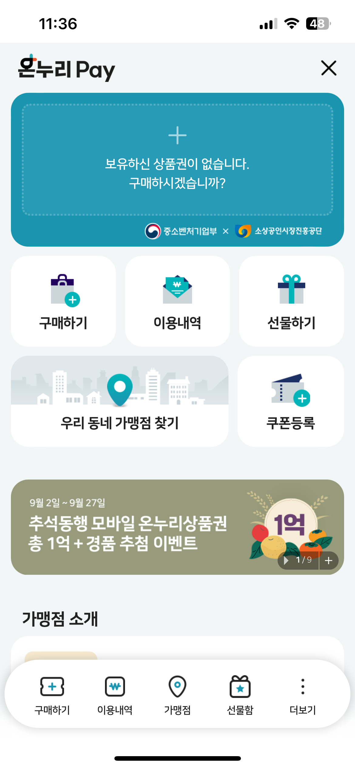 그럼 온누리페이 화면으로 전환이 되는데 여기에서 구매 / 이용내역 / 가맹점 등 모든 것을 볼 수 있습니다. 구매하기를 눌러 구매를 진행해 줍니다.