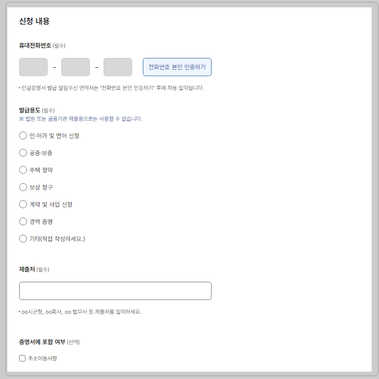 ✔️문자 인증 후 발급용도와 제출처를 필수로 작성해 줍니다.