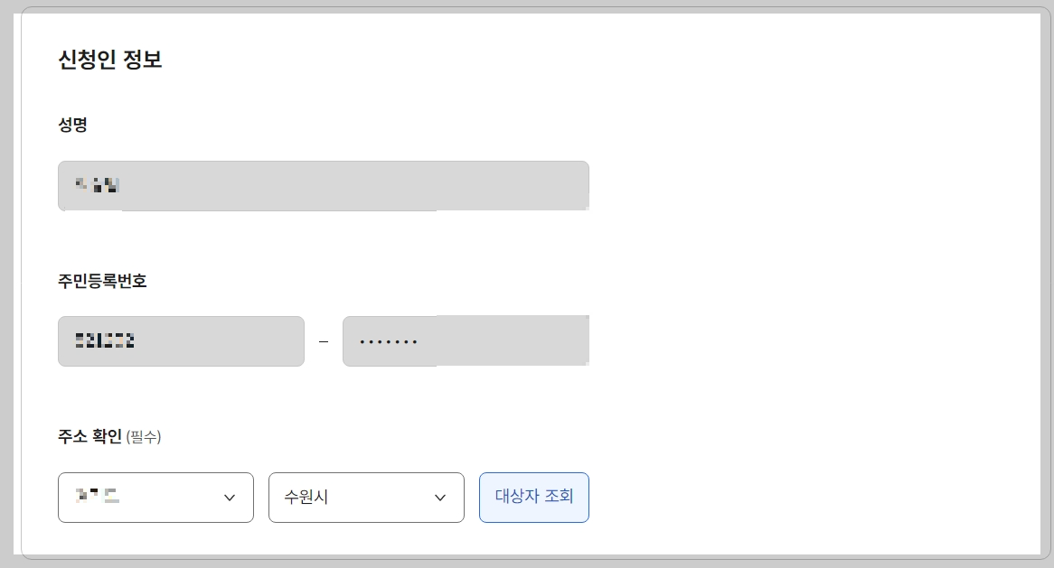 ✔️신청인 정보에 이름, 주민등록번호 확인 후 본인 주소를 선택한 후에 대상자 조회를 눌러줍니다.