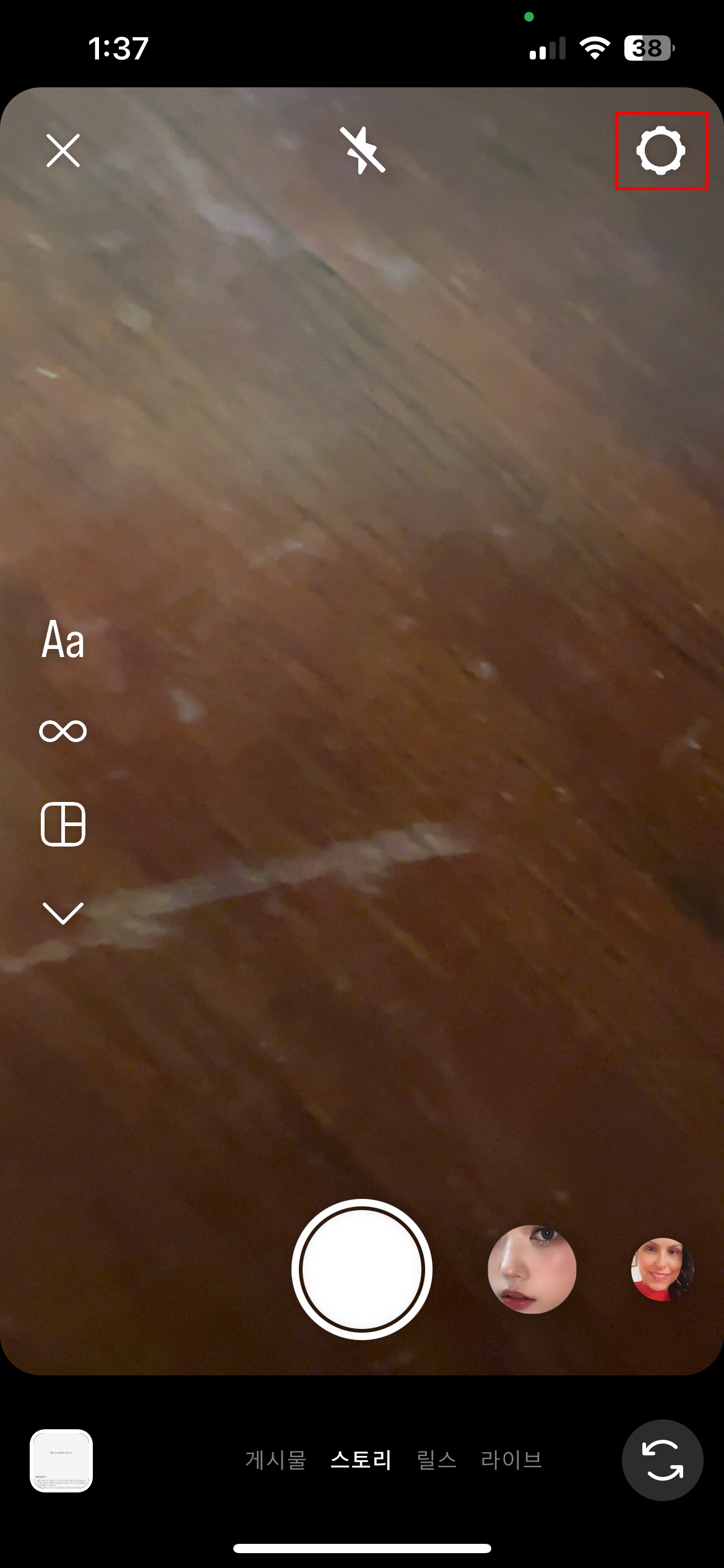 인스타그램 메인에서 왼쪽으로 넘겨 이 화면이 나오면 위에 설정 버튼을 눌러주세요.