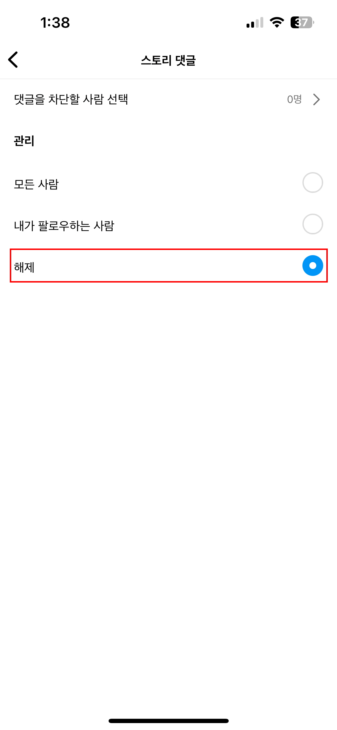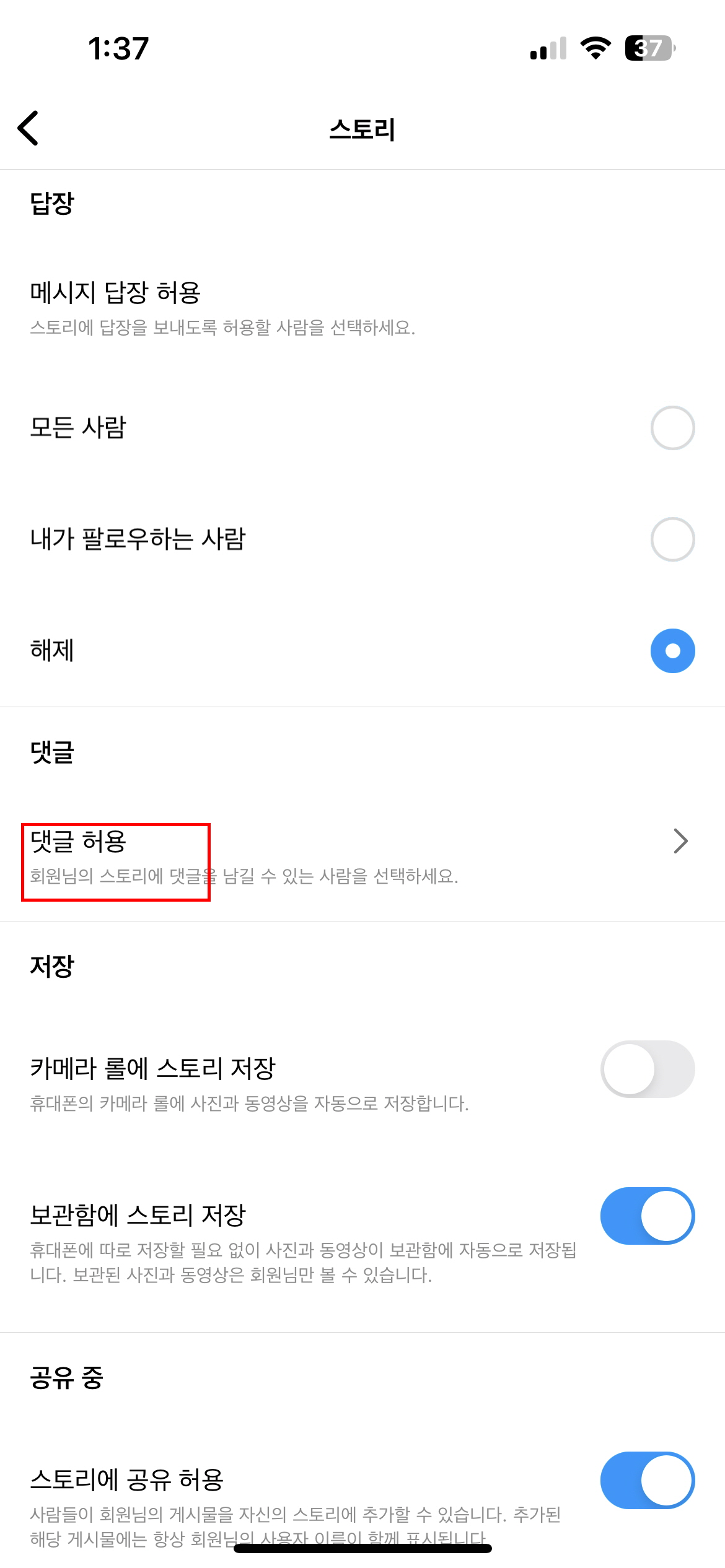 여기에서 해제를 해 주시면 댓글 기능이 사라집니다. 댓글을 차단할 사람도 선택할 수 있고, 내가 팔로우하는 사람만도 선택을 할 수 있네요!