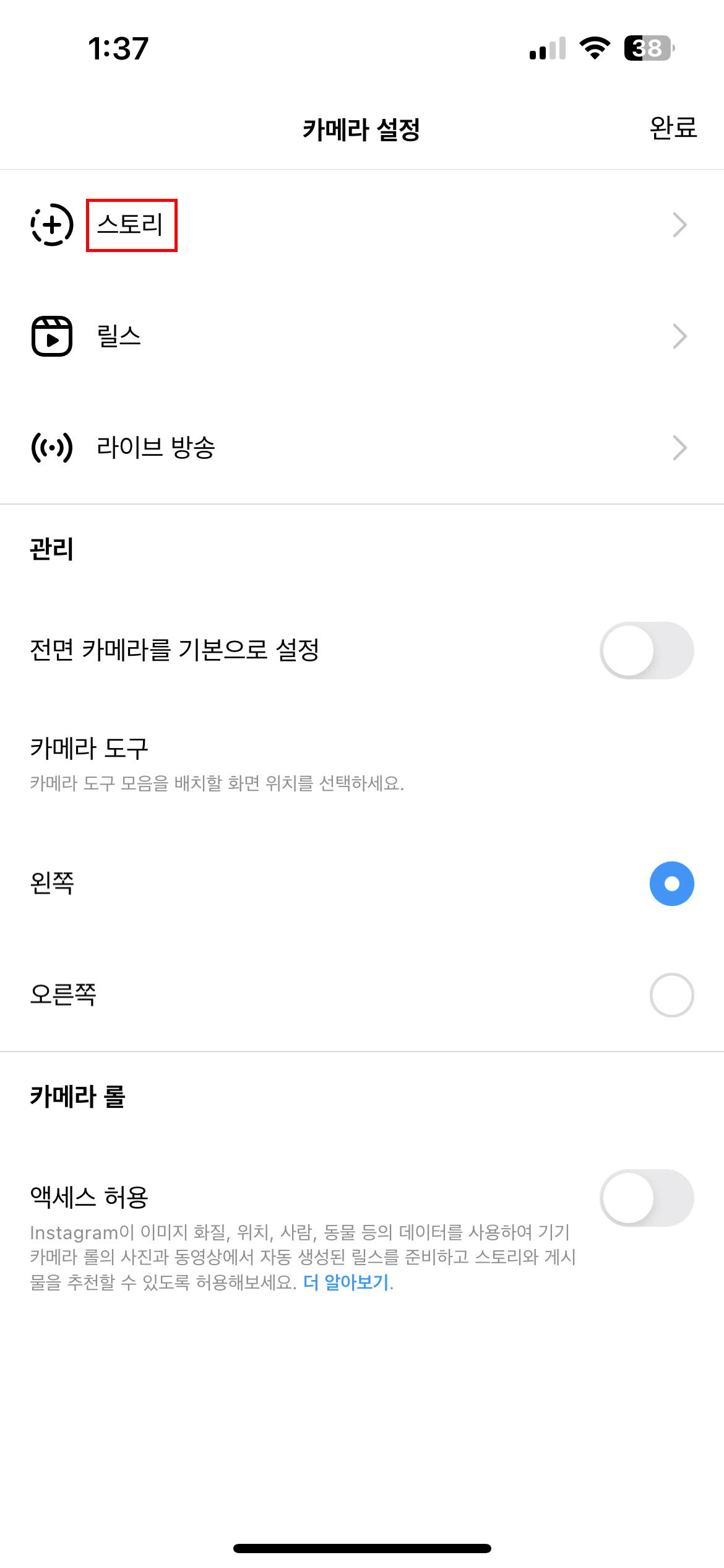 그 다음 맨 위 스토리 설정을 들어갑니다.